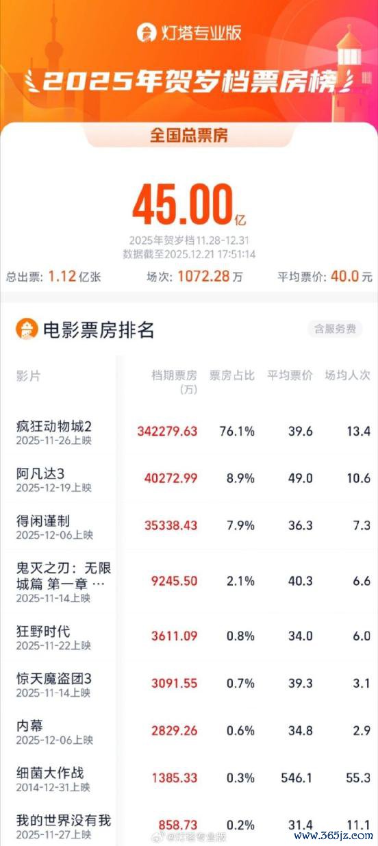据灯塔专科版,鸿沟12月21日17时51分,2025年贺岁档档期(11月28日-12月31日)总票房(含预售)冲破45亿! 更多热门速报、泰斗资讯、深度分析尽在北京日报App...
